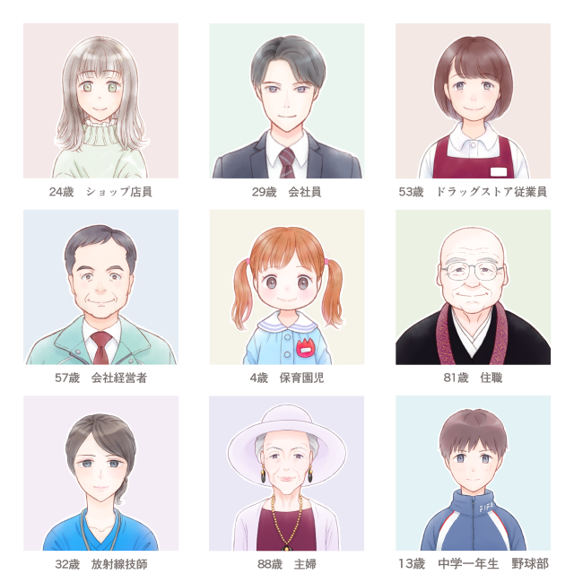 年齢層を選ばない、明るく親しみのある絵柄を得意としておりますが、他の絵柄にも柔軟な対応をさせていただきます。